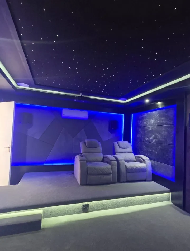 We install strong and stylish ceilings for home cinema rooms. This includes floating ceilings, LED bulkheads, cinema ceiling panels, and drop ceilings. These designs improve the look of the room, hide cables, and help with sound control, giving your cinema a clean and high-end feel.